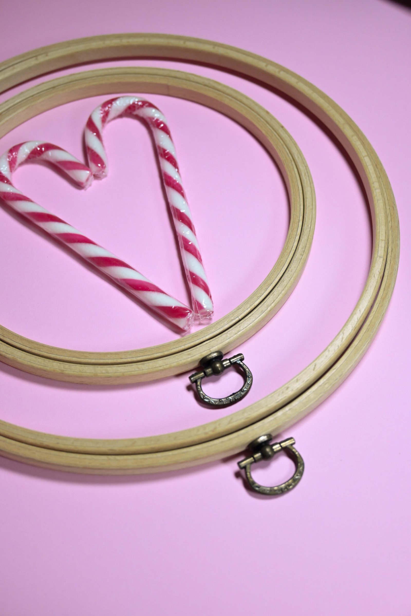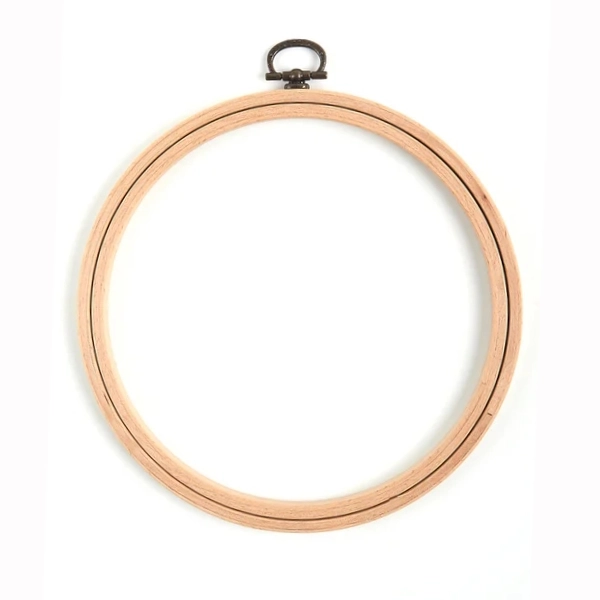 Pakabinamas lankelis siuvinėtam paveikslėliui.